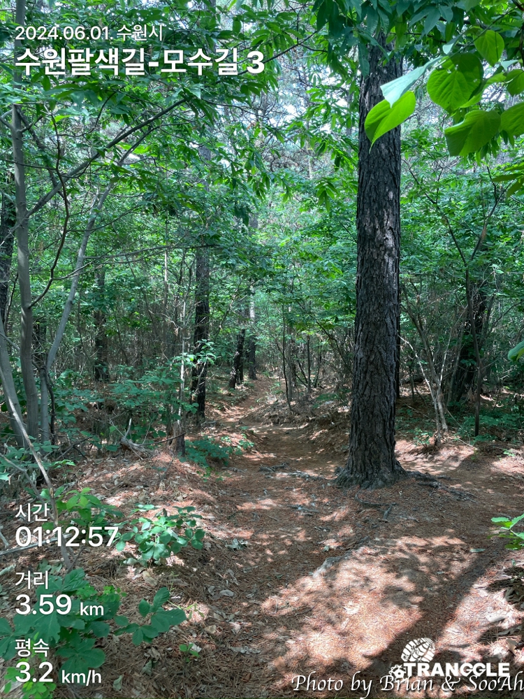 근데 여기까지 오니까 트레킹 앱이 모수길을 80% 이상 걸었다고 뱃지를 발급해주던구요... 그래서 광교산 등산로는.... 지치기도 하고 해서 여기서 그만두고 옆으로 나와서는, 모수길 트레킹을 마쳤답니다.